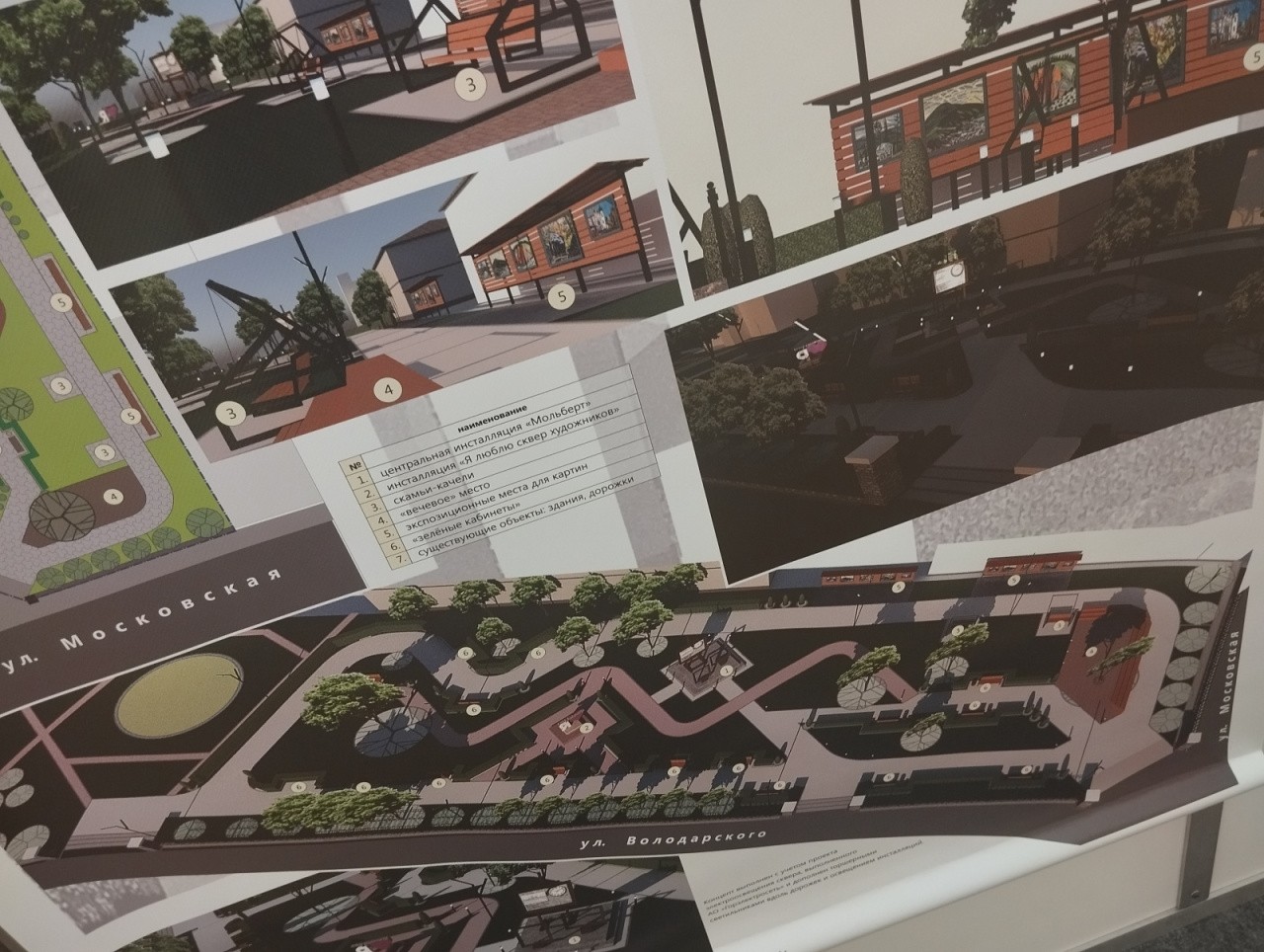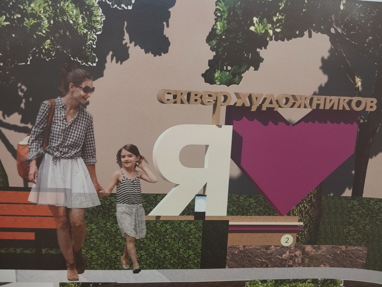 «Название сквера акцентировано в тематической инсталляции «Мольберт с рамами». На месте фонтана предполагается инсталляция «Я люблю сквер художников», – сообщает информационная справка.