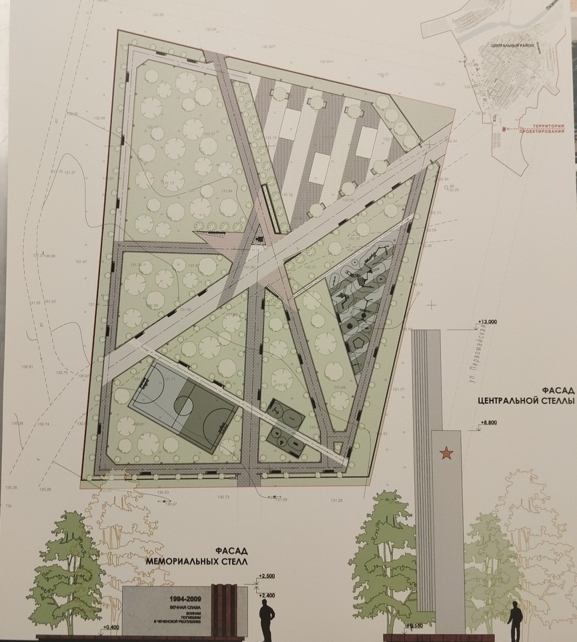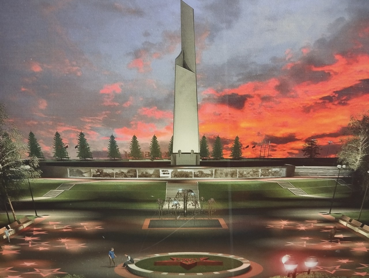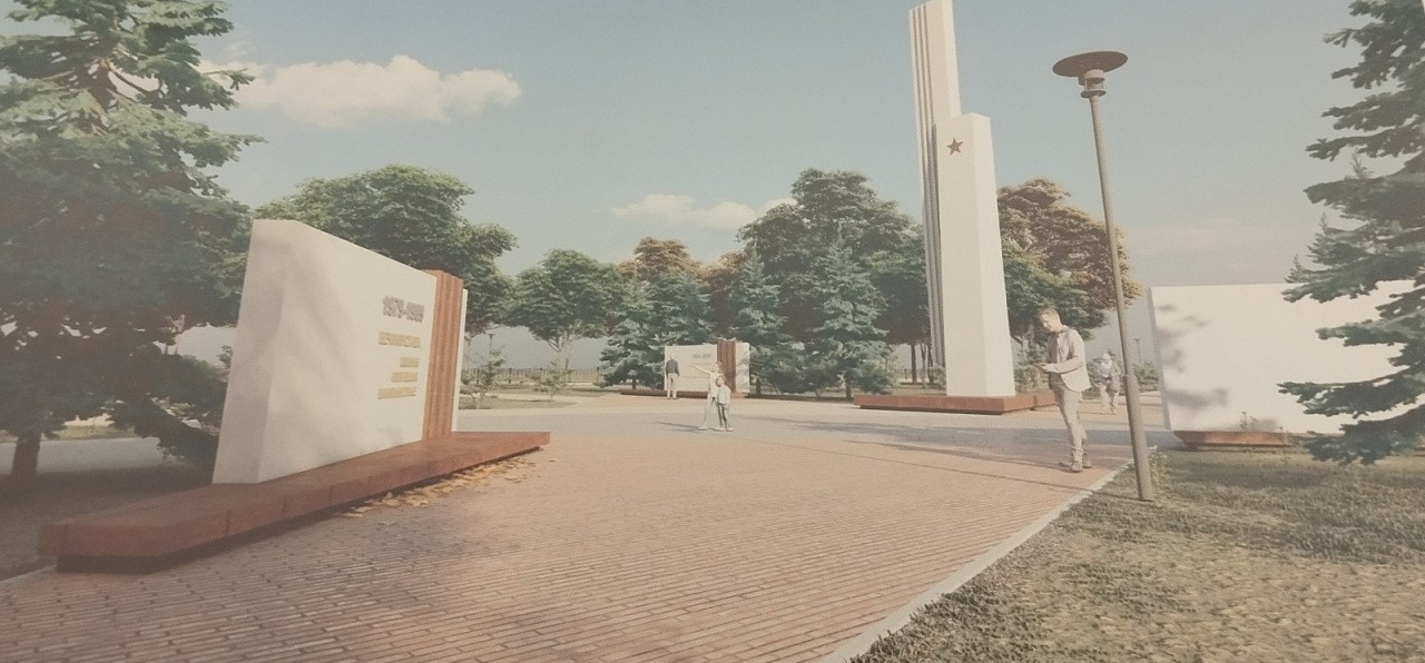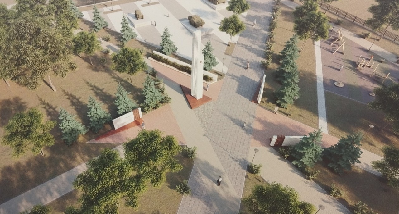 «В основе планировочной структуры парка лежит пятиконечная звезда, соединяющая различные функциональные зоны и отражающая основную идею парка. В центре звезды расположена стела Воинской славы, которая является доминантой парка. На лучах звезды организованы мемориалы воинам-землякам и труженикам тыла. Предусмотрено создание экспозиции бронетанковой техники», – написано в пояснительной записке дизайн-проекта.