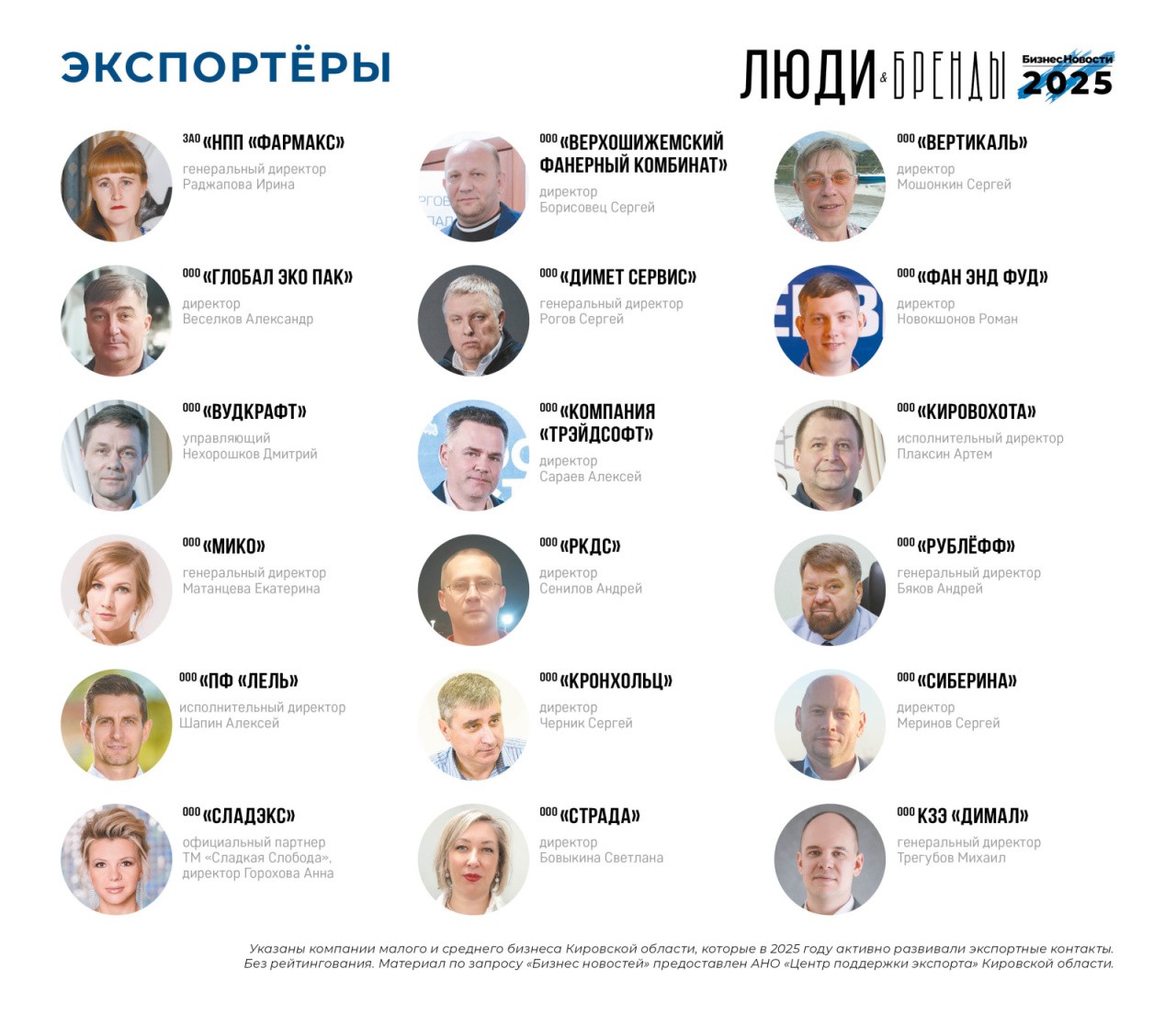 Начнем с номинации «Экспортеры», которая появилась два года назад, и по итогам 2025 года мы ее сохранили. Публикуется вне рамок рейтинга и без мест. Указаны компании малого и среднего бизнеса Кировской области, которые в 2025 году активно развивали экспортные связи и контакты.