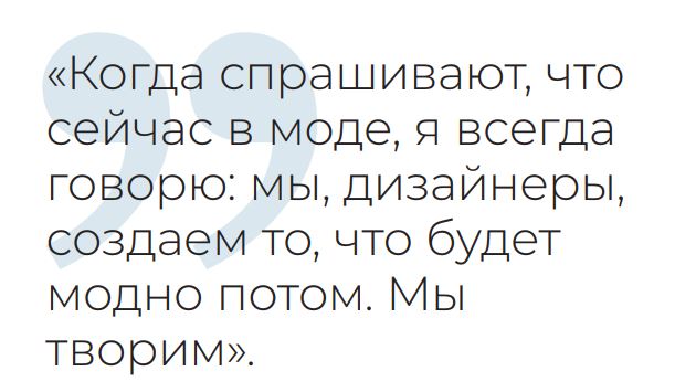 Когда спрашивают, что сейчас в моде, я всегда говорю: мы, дизайнеры, создаем то, что будет модно потом. Мы творим. Естественно, мы смотрим на мир, смотрим в улицу. Мы видим этот мир, наблюдаем за ним и не можем создавать какие-то странные, неактуальные вещи.