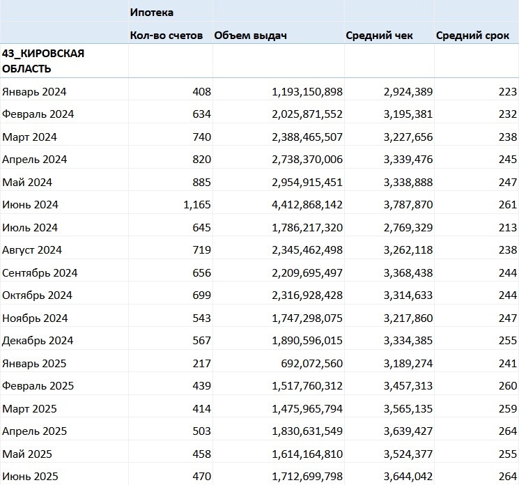 К весне-лету 2025 года ситуация стабилизировалась: в регионе ежемесячно стали выдавать 400-500 ипотек. В июне заметен небольшой рост показателя – на 2,5% (с 458 в мае до 470 в июне). При этом общая сумма выданных ипотек выросла приблизительно на 100 млн рублей – с 1 млрд 614 млн в мае до 1 млрд 712 млн в июне. Средний чек практически не менялся, оставаясь на уровне 3-3,5 млн рублей.