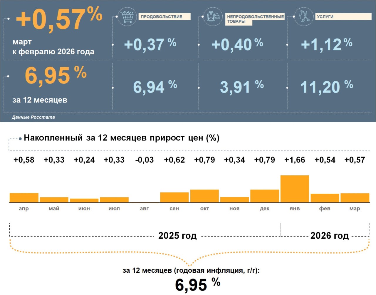 «В регионе за месяц цены увеличились на 0,57% по сравнению с февралем. Годовая инфляция снизилась до 6,95%. Это выше, чем в целом по стране (5,86%)», — прокомментировали в отделении.