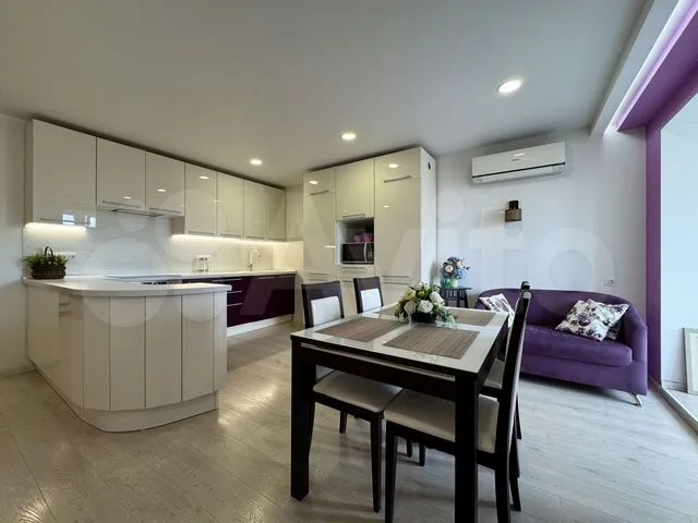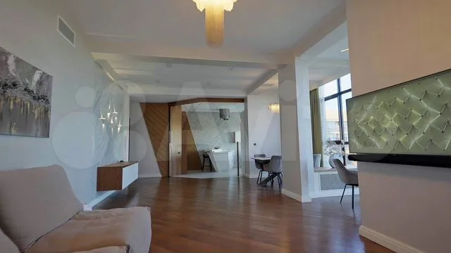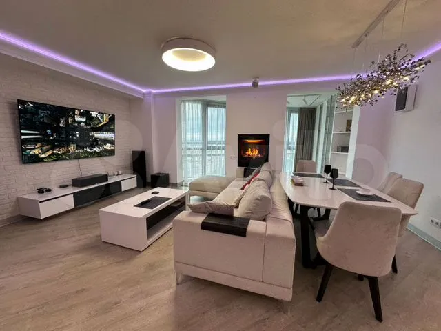 Квартира находится на Октябрьском проспекте. Согласно объявлению, в прихожей есть шкаф для одежды, диван, умное приветственное освещение, видеодомофон, панель охранной системы и видеокамера. Гостиная совмещена с кухней, есть обеденный стол с каменной столешницей, диван, телевизор, подвесная тумба и медиацентр; в стену встроен реалистичный электрокамин, установлена регулируемая подсветка. Имеется утеплённая лоджия с видом на проспект, вместительный буфет до потолка с подсветкой, шторы с электроприводом. Выполнен дизайнерский ремонт, высота потолков — 2,7 м.