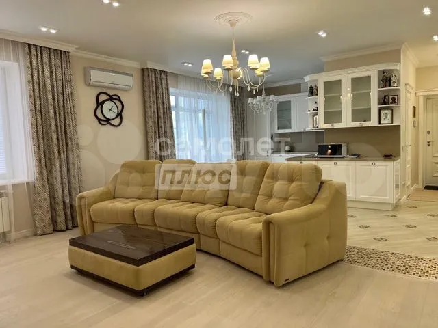 Квартира расположена на улице Урицкого. Согласно описанию, объектом почти не пользовались, выполнен дизайнерский ремонт с использованием дорогих материалов; в стоимость входит вся обстановка, представленная на фото. Планировка включает гостиную, объединенную с кухней, две изолированные комнаты и два санузла. Полы выполнены из паркетной доски, на кухне и в санузлах — керамогранит. Потолки натяжные, высотой 2,7 м.