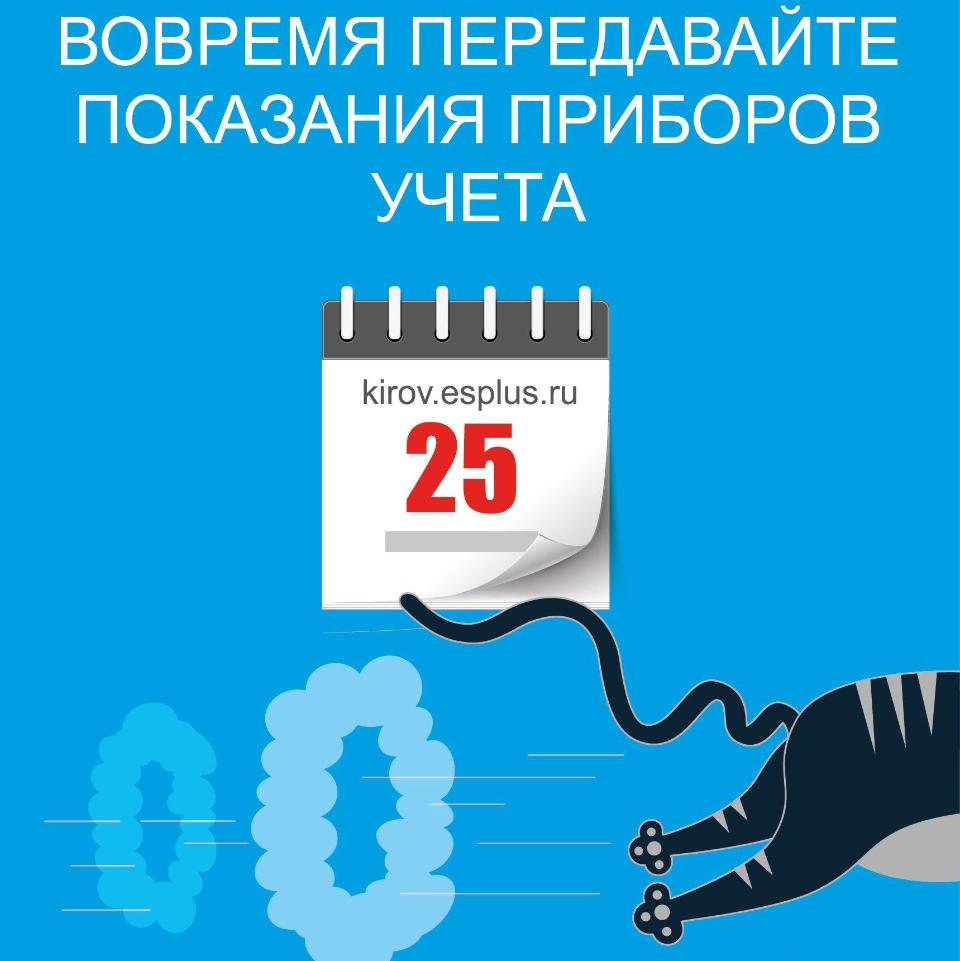 Кировский филиал «ЭнергосбыТ Плюс» напоминает, что передавать показания приборов учёта по электроснабжению и горячей воде и оплатить услуги необходимо до 25 декабря. Отправлять данные нужно, даже если ресурсы совсем не потреблялись.