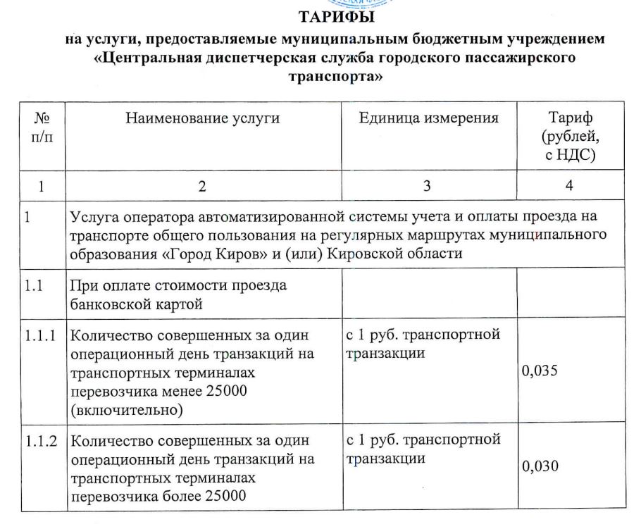 В Кирове для ЦДС установили тарифы за оплату проезда