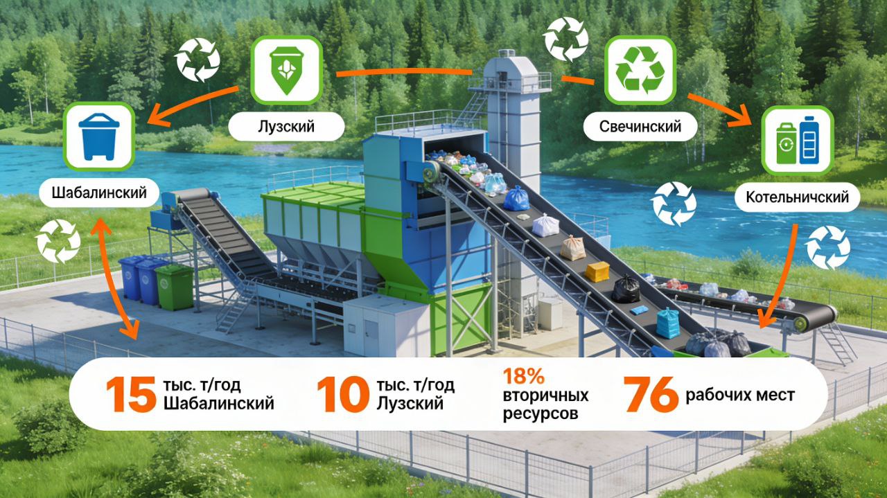 В Лузском округе — МСС мощностью до 10 тыс. тонн ТКО в год, где будут сортироваться отходы Лузского и Подосиновского районов. На обеих станциях предусмотрен отбор до 18 % вторичных ресурсов: макулатуры, картона, металлов, стекла и пластика.