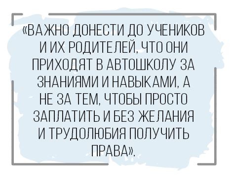 Ключевой задачей она считает работу с сознанием потребителей. «Сегодня действительно за правами идет много молодежи. Как руководитель автошколы, я убеждена, что сегодня ключевая задача – работать с сознанием потребителей: учеников, их родителей, выпускников. Важно донести до учеников и их родителей, что они приходят в автошколу за знаниями и навыками, а не за тем, чтобы просто заплатить и без желания и трудолюбия получить права. Мы должны продвигать в массы мысль, что водительское удостоверение – это не финиш, а лишь начало водительского стажа, а качественное обучение и дополнительные занятия – это не дополнительные траты, а инвестиция в собственную безопасность и безопасность окружающих. Приходя в автошколу, ученики должны ценить не скорость обучения и дешевизну, а реальное качество подготовки».