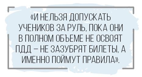 Комментируя ситуацию «натаскивания на экзамен», она подчеркнула, что нужно посмотреть шире: в отрасли – системный кризис: «Главная причина кризиса – это теоретические Правила дорожного движения, соответствующие европейским стандартам, и фактические дороги, которые не соответствуют правилам. Из-за этого несоответствия у новичков в голове страх, а у обучающих организаций не хватает компетентности и профессионализма, чтобы сделать из хаоса порядок». Она отмечает, что в таких условиях получение прав для некоторых кандидатов может растянуться на годы, если изначально был выбран неверный подход.