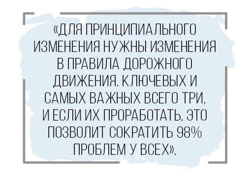 При этом она предлагает конкретные и точечные изменения на федеральном уровне. «Для принципиального изменения нужны изменения в Правила дорожного движения. Ключевых и самых важных всего три, и если их проработать, это позволит сократить 98% проблем у всех». Во-первых, по мнению эксперта, необходимо уточнить некоторые термины и определения: «Например, что такое препятствие. Припаркованная машина не считается препятствием, поэтому при повороте направо мы вначале должны повернуть в препятствие, а потом его объехать, что вызывает бешенство всех окружающих водителей». Во-вторых, –уточнить некоторые знаки и разметку: «Например, сплошная полоса не имеет никаких причин для ее пересечения, а если едешь по узкой улице, приходится пересекать ее сотни раз для объезда препятствий, и все это считается нерегламентированными нарушениями».