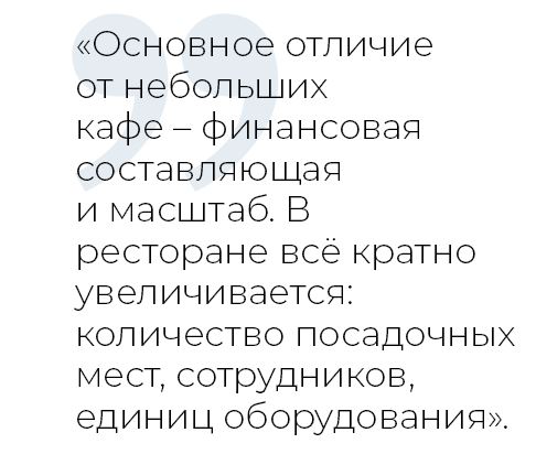 — С точки зрения операционных процессов, принципиально нового ничего не появляется. Те же бизнес-процессы на кухне и в зале, необходимость в шефе и линейном персонале остаются. Основное отличие — финансовая составляющая и масштаб.