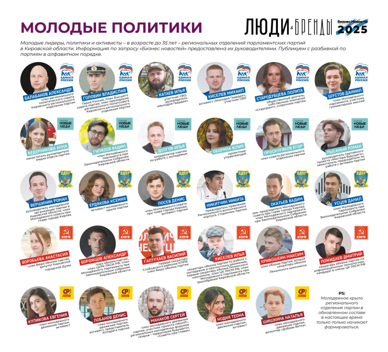 Мы решили показать политически активную молодежь Кировской области и целенаправленно поддержать новое поколение лидеров. Именно молодежное крыло партий формирует кадровый резерв, привносит свежие идеи и энергию, определяя в том числе политическую повестку на перспективу. Кандидатов по просьбе «Бизнес новостей» представили региональные отделения парламентских партий.