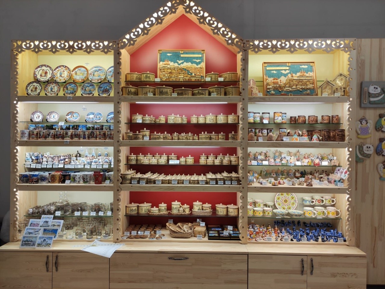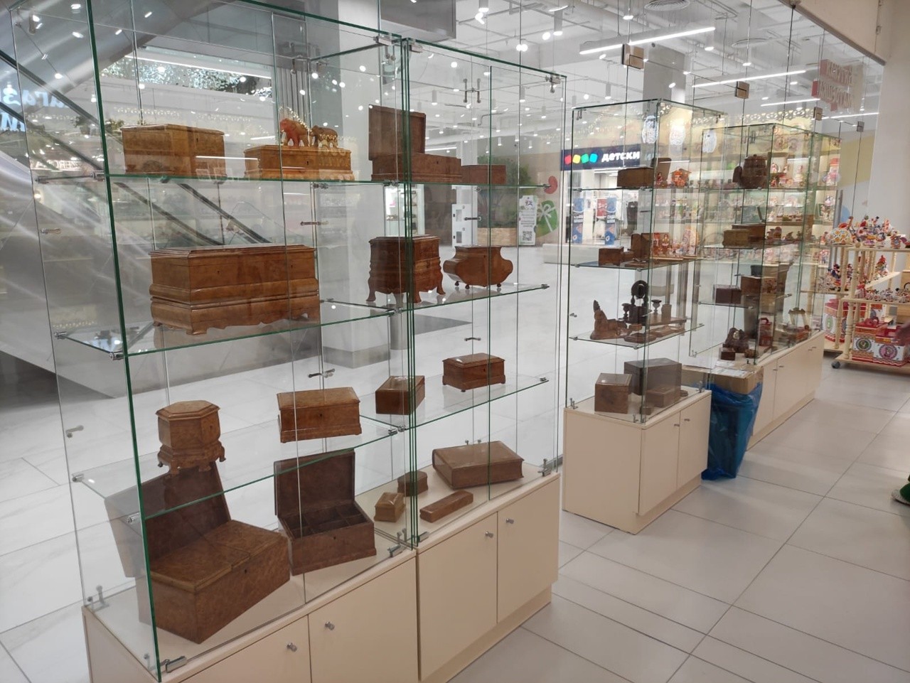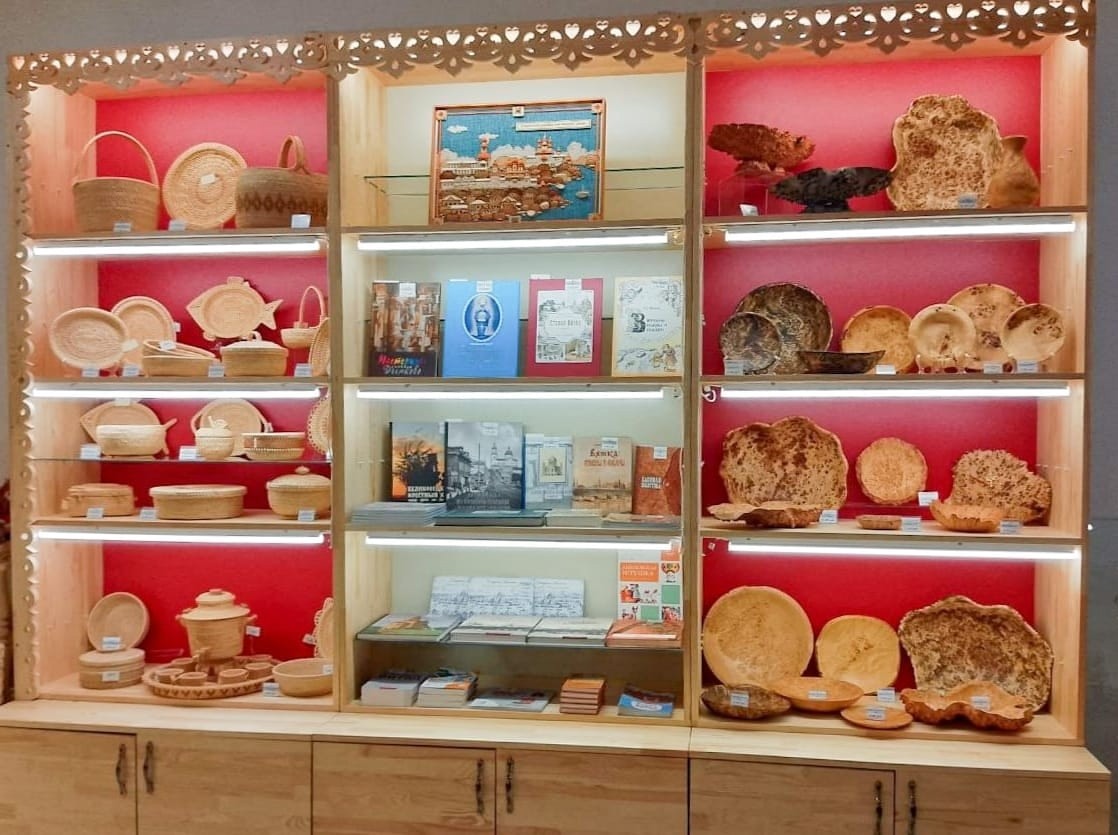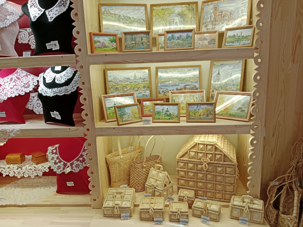 Как пояснила Ирина Раева, посетители смогут открыть здесь для себя многих местных умельцев. Так, например, деревянное панно изготовил мастер Вячеслав Трушков, на полках стоят матрёшки Светланы Лонченковой, Татьяны Пермяковой, авторская керамика мастерской «Внуки Врубеля» и изделия других частных мастеров.