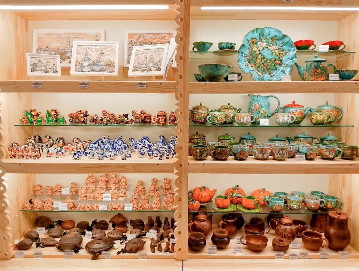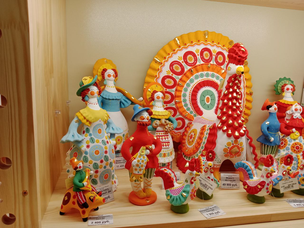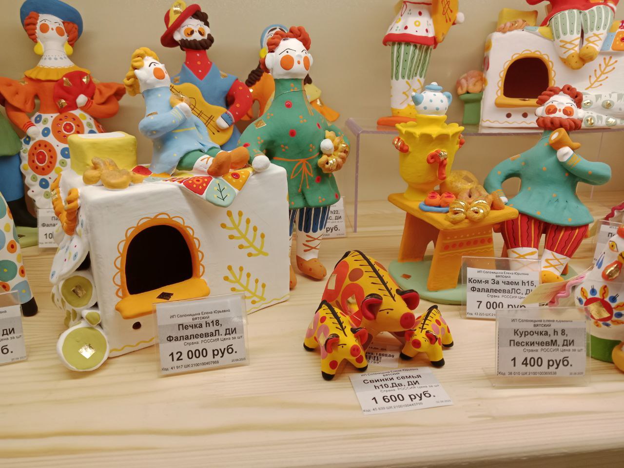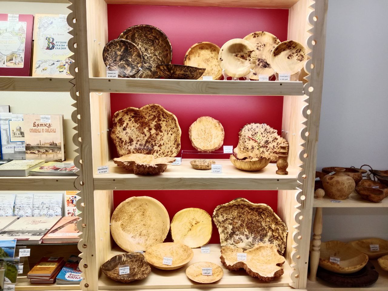Параллельно гостям рассказывают о других вятских промыслах. В магазине-музее представлены основные из них: дымковская игрушка, кукарское кружево, плетение из соломки, бурачный промысел, нолинская матрёшка. Есть здесь продукция из лозы, из бересты, есть авторская керамика.