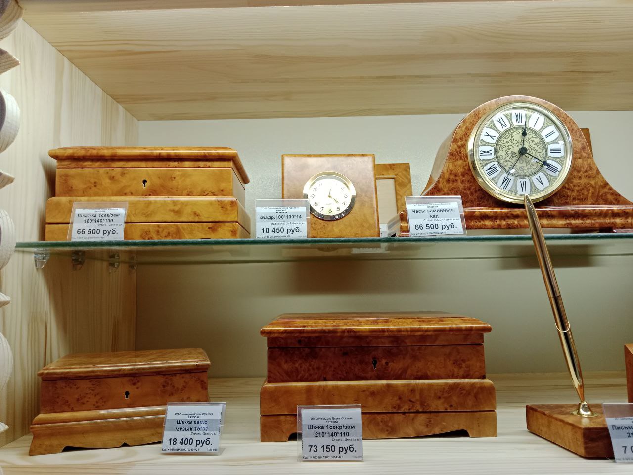 Коллекция включает изделия, которые могут заинтересовать ценителей. Например, представительского уровня. К ним относятся каповые шахматы (сама доска сделана из капокорня, а фигурки – из ювелирной смолы с янтарём внутри), двадцатипредметные коллекционные матрёшки, стоимость которых превышает 220 тысяч рублей.
