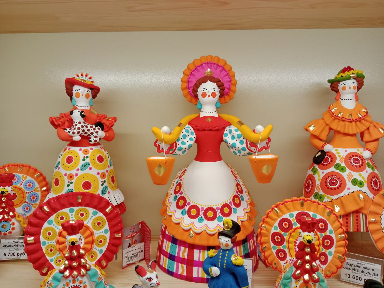 Тех, кто думает, что дымковской игрушкой его уже не удивить, тоже ждёт открытие – это барыни и индюки высотой порядка 40 см или целые композиции – вот люди гребут на лодке, вот мужик пьёт чай из самовара с баранками, вот русская печь… В композициях реализованы авторские замыслы и высокий уровень мастерства.