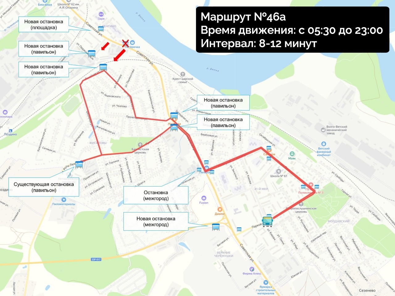 Рейсы маршрута № 46 «Геозавод – районный суд» (Нововятский район) будут выполнять 14 автобусов с интервалом движения в часы пик 10-15 минут, в межпиковое время – 20-25 минут. В выходные дни будут работать 10 машин с интервалом движения в час пик 14 минут, в остальное время – 28 минут.