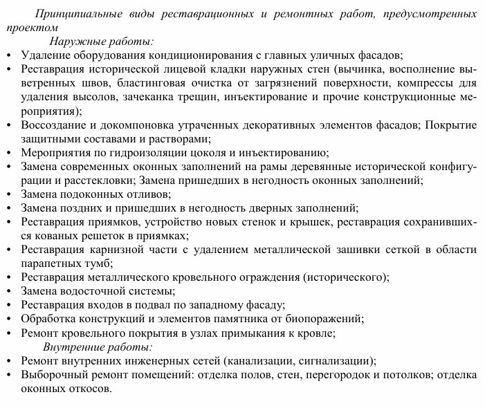 Согласно техзаданию, подрядчик должен выполнить «реставрацию исторической лицевой кладки наружных стен», «воссоздание и докомпоновку утраченных декоративных элементов фасадов и покрытие их защитными составами», а также другие виды работ.